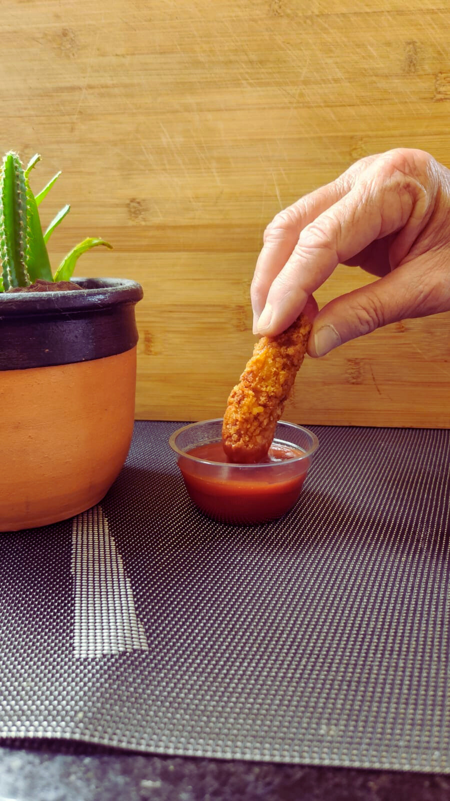 A receita ficou guardada por muitos anos e um dia experimentamos, era deliciosamente exata: um frango frito bem macio e gostoso por dentro e com uma cobertura tão crocante que dá para ouvir o crunch.